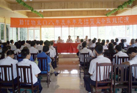 “业主满意是我们永远的追求!”一阵激昂的公司宣言拉开了成都勤信物业服务有限公司“2008年半年总结暨业务技能汇演”的序幕。会上,总经理周雪平对公司及全体员工在遭遇地震天灾、物价上涨等多种困难的上半年中所取得的成绩表示了肯定,同时也对下半年的工作提出了期望。