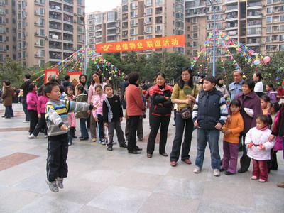 在整个活动现场,不少业主都是一家老少齐上阵。特别是双人绑腿跑与双人夹运气球活动,很多家长都是与孩子相互配合、共同完成的。不少大爷大妈也不示弱,跳绳、踢毽子都踊跃参与,广场上笑声、加油声不断,现场气氛活跃热烈,既开心、紧张,又秩序井然。