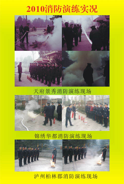 为落实“(悦·香港)字(集团)〔2010年〕第0001号”文件实质,为保证新春佳节来临之际安全防范工作的有序开展,为进一步加强秩序维护队员的消防安全教育,提高火灾防控能力和突发事件应变能力,学会正确使用灭火器和各类消防设备设施。2010年01月,四川悦华置地成都公司锦绣华都区域公司的两个项目(天府景秀、锦绣华都)和重庆公司柏林郡项目在片区经理及管理处负责人的指导下,相继组织了一次节前消防实战演习。