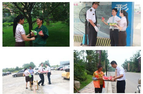 为践行“员工是资本”的企业文化理念,真正体现企业文化的落地,行政部将8月定为“夏日送清凉活动月”。为使一线的职员们能在当场就感受到来自公司的关爱,公司将清凉食品定为夏季最消暑的西瓜及有去火功效的薄荷水,从凯德风尚项目到停车场,从香颐丽都、鹭湖宫到康城合一庭,从郫县逸都到郫县198,从温江规划局到国旅投资办公区再到牧山丽景项目,公司各部门负责人为可敬的职员们一一递上了清凉的消暑食品同时还关切的询问他们的身体、生活状况。