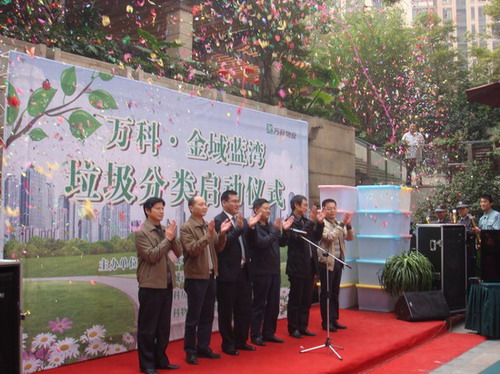 在成都市政府、成都市城市管理局等部门的大力支持、倡导下,经过3个月的准备工作,由成都万科房地产有限公司、成都万科物业服务有限公司主办的生活垃圾分类处理启动仪式上周六在金域蓝湾举行,成华区辖区内的万科金色家园、金域蓝湾有幸成为全市首批实现垃圾分类的小区。