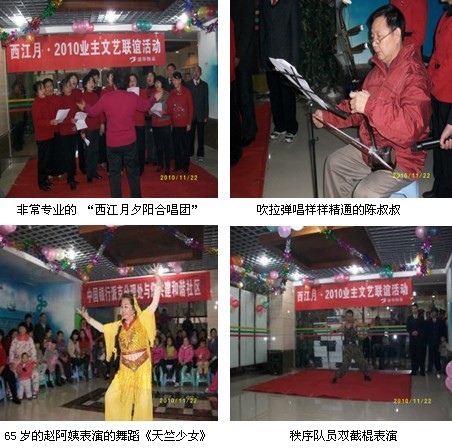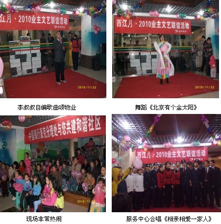 为增进业主间邻里友谊,促进物业与业主间的感情交流,丰富小区业主业余文化生活,西江月物业服务中心于2010年11月27日举办了以“业主物业一家亲,共建和谐小区”为主题的业主文艺联谊活动。此次活动主要形式为文艺表演,得到了各种年龄阶层特别是老年朋友们的积极参与,活动现场热闹非凡,到处洋溢着快乐的气氛。