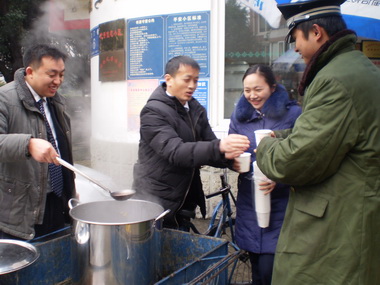 还来不及拍掉身上的雪花,项目经理曾斌火速带领内双楠片区的管理层代表,买红糖熬姜汤,在第一时间将关怀和温暖送到坚守岗位的一线职员手上。