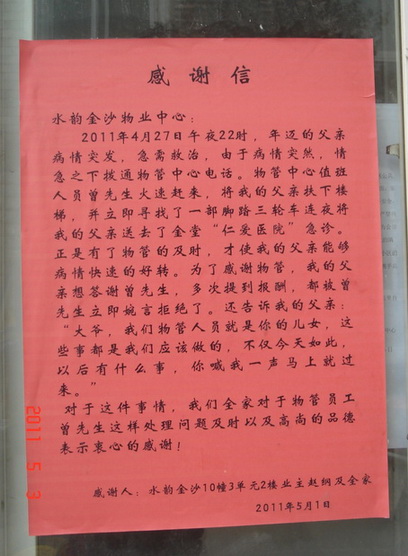据了解,由金堂县委、金堂县人民政府主办,金堂县城乡房管局承办的“2011成都金堂城市荣誉盛典”于4月22日晚在县政府广场隆重举行。成都市科恒置业顾问有限公司等七家物业服务企业发杨“特别能吃苦、特别能战斗、特别能奉献”的精神,义务为盛典活动提供保安人员无偿进行安保工作,确保了盛典活动的安全、顺利进行。为树立典范,表彰先进,经县房管局研究决定对7家物业服务企业表彰。县房管局希望受表彰的企业戒骄戒躁,发扬成绩,再接再厉,开拓进取,进一步做好物业服务管理与服务工作,为构建和谐物管、宜居金堂和建设丘陵地区城乡统筹示范县城做出新的贡献。