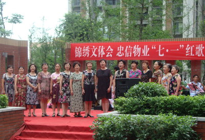 为迎接中国共产党成立90周年,丰富小区文化生活,2011年6月22日下午,忠信物业“七·一”红歌会在锦绣东方小区中心广场拉开帷幕。红歌会由忠信服务中心与小区文体会联合发起,成华区电视台、跳蹬河街道办、杉板桥社区等嘉宾应邀参加。