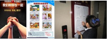 5、 安抚:在此期间,各物业服务中心及时通过短信平台、社区告示栏、消防广播系统和QQ群向业主反馈服务信息和灾区动态,在第一时间向所有业主发了温馨短信,安抚惊慌失措的业主及其家人,服务中心24小时开放值班,对业主提出的问题进行及时查看和处理。同时快速设计印刷并向业主发放《地震逃生自救知识》宣传DM单。
