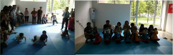 此次活动共策划了宝宝爬行比赛、跟我说英语、巧手画童年三个项目。孩子们高兴地唱着、跳着、尽情地享受着节日的快乐。上午九时,活动正式开始:瞧,爬行垫上那个小乖乖,怎么了?还没到终点怎么就不继续前行了呢?累了?困了?噢,原来是尿尿了!这边“跟我说英语”小组的小朋友们在咿咿哇哇地唱着英语儿歌;那边画画的孩子们在洁白的气球上、画纸上涂抹着童年的梦想……