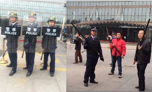 民兴物业秩序维护队负责值守1号大门、3号大门,广电为秩序维护队员统一配发了反恐防护装备(警用头盔、盾牌、橡胶棒、狼牙棒等)。民兴物业广电项目管理部抽调20名秩序维护队员,分成三个战斗小组,集中住宿在广电。按广电保卫科和物业项目管理部共同制定的反恐维稳防范方案,各战斗小组首先熟悉各自的守护位置,跑动路线,防备器械的使用以及协同配合口令。