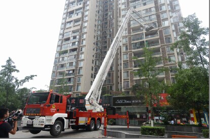2014年6月27日,蓝光嘉宝物业“红色警戒”——物业、消防、住户联合消防仿真演练在蓝光御府花都小区打响。