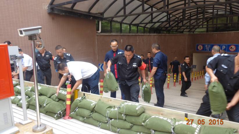 下午2:30,防汛演练正式开始。接到监控室的涨水险情通知后,各部门人员迅速到达事发现场。现场抢险总指挥田凤山对大家进行了明确的工作布置后,各部门人员以最快的速度到达岗位、各尽其责。抢险组组长曾文带领秩序维护人员迅速将平时备在车库入口防水挡板安放好,将沙袋有序的分层码放在防水挡板的前面和后面、防止水势进一步漫延到地下车库里,工程人员带着抽水水泵奔赴水系低洼处,有序地进行排水。客服人员、保洁人员和工程人员奔赴地下车库及周边和设备房查看否有漏水和进水的情况发生。