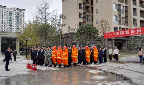11月9日是全国“119”消防宣传日,为进一步加强东山国际新城各小区的消防安全工作,提高物业公司员工和小区业主的消防安全意识,有效预防小区火灾事故的发生,在11月9日下午2点,华怡科尔物业公司联合龙泉派出所和柏合镇派出所消防民警在东山国际新城H区开展了“重视消防安全,打造平安小区”的消防演练,部分业主代表参加了此次活动。