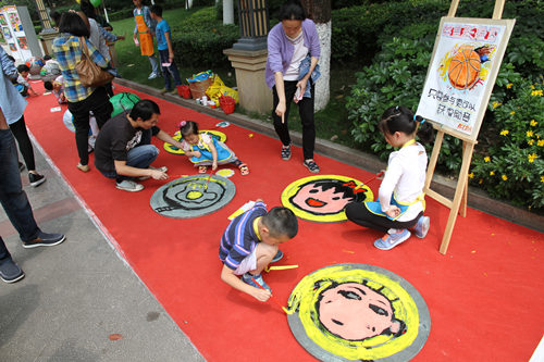 5月28日(星期六),活动于13:30准时开始,虽然骄阳似火,但也阻挡不住小朋友们快乐的心情,一只只兴奋的“小蝴蝶”迅速地飞向各项游戏中去,有词语接龙,沙瓶画,蛋糕分享,两人三足、涂鸦绘制等游戏。看,在彩绘长绢中,小朋友们各自选中自己喜欢的图案,尽情畅想,勾勒出五彩斑斓的图案。最有特色的要数在石墩和窨井盖上面作画了,有的在上面画了一个大西瓜,有的画出调皮可爱的大嘴猴,看着这些活灵活现的彩图,我们也被大院这道亮丽的风景线所感染。