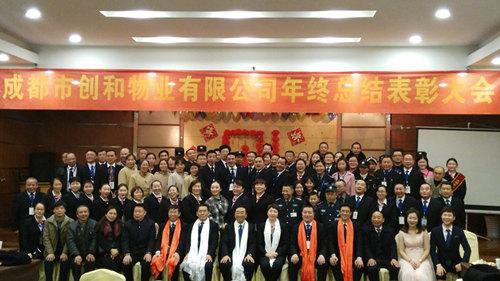 成都市创和物业有限公司于2017年1月19日在成都市九寨沟饭店召开2016年年终总结大会,参加此次大会的领导有成都市创和物业公司董事长文映忠先生,常务副总甘国勇先生,董事长顾问梁树尧先生,副总李开容女士,总经理文晓红先生等高层领导,以及各项目经理及公司员工代表等。