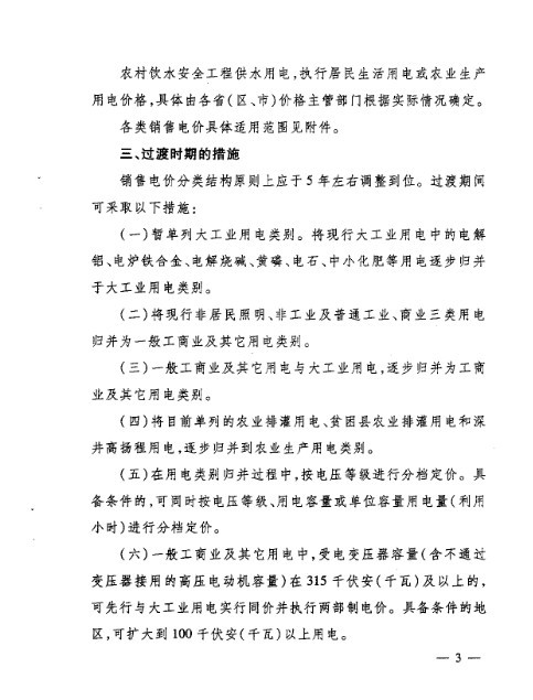(二)将现行销售电价逐步归并为居民生活用电、农业生产用电和工商业及其它用电价格三个类别。