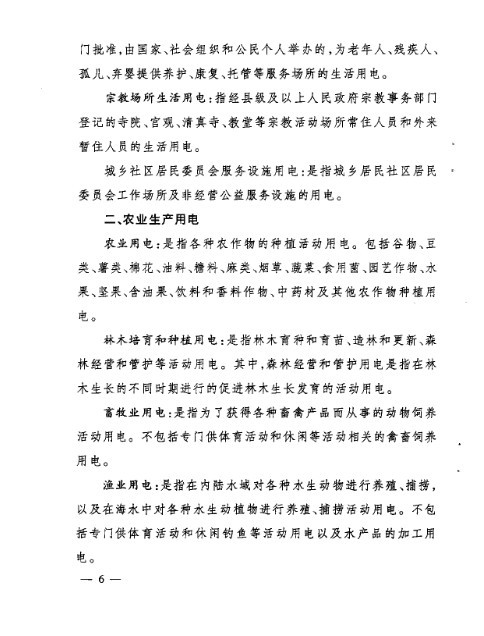 (二)农业生产用电价格,是指农业、林木培育和种植、畜牧业、渔业生产用电,农业灌溉用电,以及农业服务业中的农产品初加工用电的价格。其他农、林、牧、渔服务业用电和农副食品加工业用电等不执行农业生产用电价格。