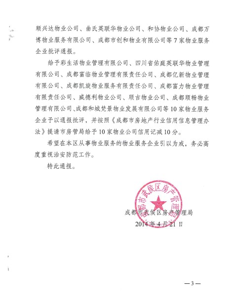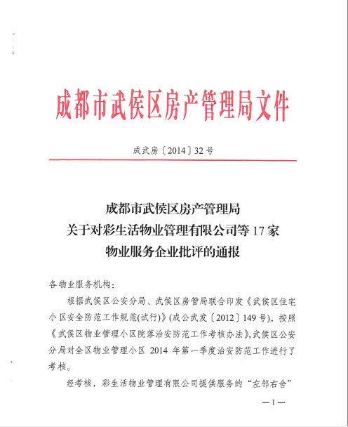 上一条:关于对四川通用物业管理有限公司等6家物业服务企业表扬的通报 下一条:关于五星级住宅区申请推荐授予2014年度“市优”称号的通知