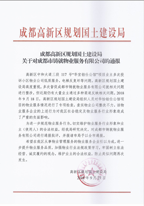 成都高新区规划国土建设局关于对成都市铸就物业服务有限公司的通报