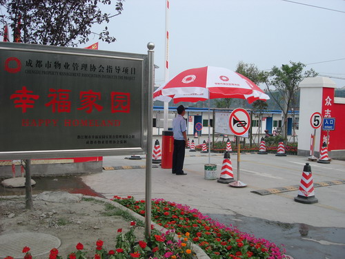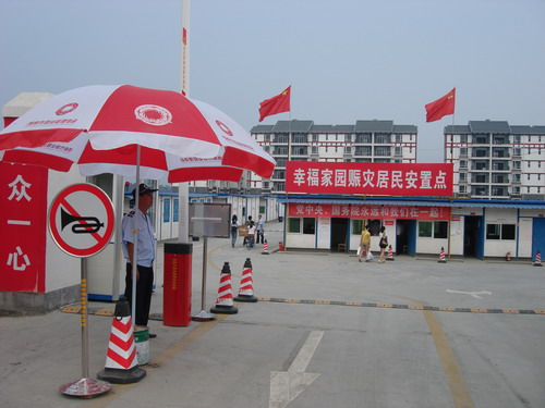 “我们这儿跟城头的小区一样,也有专业化的物业服务了。”都江堰幸福家园活动板房安置点居民李建明满脸笑容地说。7月11日,笔者来到都江堰幸福家园,门卫标准地敬礼之后,自动化的车栏杆缓缓放行。放眼大门口,摆满鲜花的道路旁边“单行道”、“禁止鸣笛”、“左转弯、右转弯”等字样交通指引牌整齐地树立,小区总平面图赫然呈现各幢房屋和公共配套设施的方位,小区便民服务广告也被集中在商业信息栏目。“想不到这里还能享受到专业化的物业服务!”随行的同事满脸疑惑。