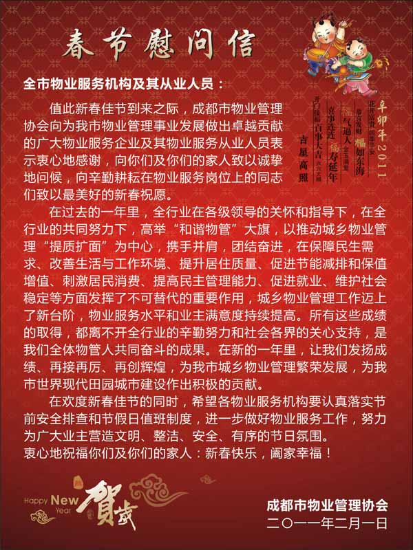 上一条:我市物管行业隆重庆祝三八妇女节 下一条:关于领取《成都市物业管理公共信息标识规范应用手册》的通知