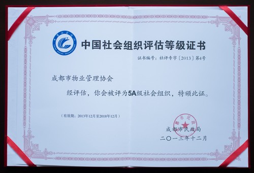 在2013年的社会组织评估活动中,成都市物业管理协会以务实创新的工作思路,严谨高效的工作作风,积极向上的工作氛围,亮点纷呈的工作业绩得到社会组织评估委员会专家的一致好评,并在全市社会组织中脱颖而出,获得最高5A级评价。