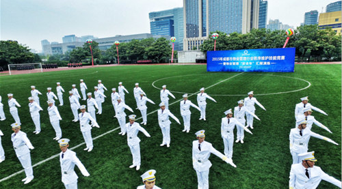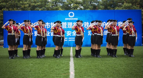 10月17日下午,由成都市物业管理协会主办的2015年成都市物业管理行业秩序维护技能竞赛暨物业管理“安全年”汇报演练活动在成都职业技术学院盛大举行。来自成都市物业管理行业的17支企业代表队和近千名物业服务人员参加了本次竞赛和汇报演练。成都市城乡房产管理局物业管理处副处长姜鲁东、调研员唐宗伟,成都市成华区房产管理局副调研员传光全受邀出席活动。成都市物业管理协会会长闻涛,副会长温文遐、陈干平、田永云、李轶梅、梁古芬、杜小云、曹毅、李立新,秘书长巫庆敏等领导出席活动。竞赛评委由唐宗伟调研员、传光全副调研员、温文遐副会长,以及特邀嘉宾四川时尚职业培训学校副校长宾冰,成都市公安局交通管理局第一分局警官赵亮华担任。