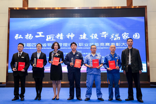 四川省房地产业协会物业管理委员会副主任、成都市物业管理协会常务副会长兼秘书长巫庆敏为“技术能手”获奖选手颁奖