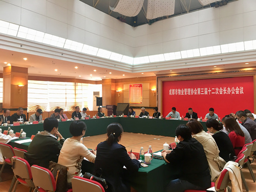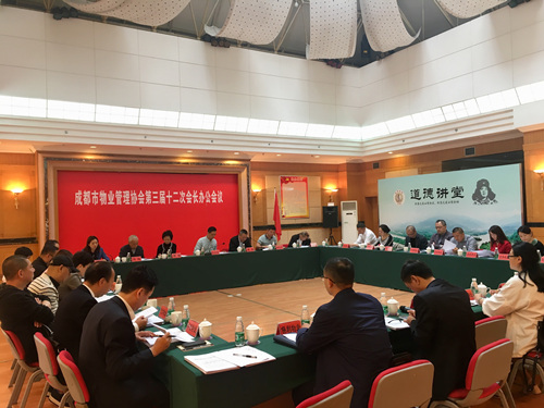 4月25日上午,成都市物业管理协会召开第三届十二次会长办公会议,组织专题学习了市委组织部、市委社治委、市民政局、市房管局四部门联合印发的《关于全面提升物业服务管理水平建设高品质和谐宜居生活社区的实施意见》(成社治发〔2018〕1号)和市房管局《关于开展以“我爱成都 美丽家园”为主题的物业管理“品质年”活动的通知》(成房发〔2018〕30号)。市房管局物管处处长袁庆华到会指导并讲话,监事会列席会议,闻涛会长主持会议。